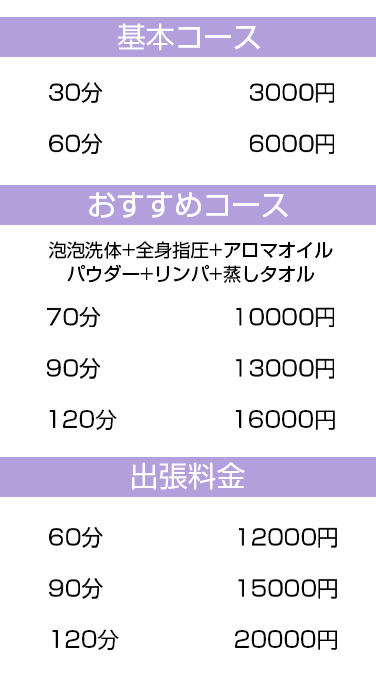 当店では、アロマオイルの効能と当店自慢のセラピストによるリンパマッサージの相乗効果による、癒しのひとときをお客様お一人お一人にお届けしております、自然で心やすらぐ優美な香りを、施術中はもちろんご帰宅お休みになってから翌日朝目覚めでまで楽しんで頂けます、どうぞゆっくりご堪能ください。